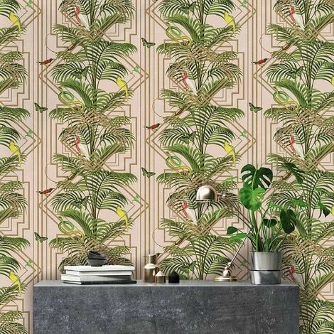 This stunning Congo Geometric wallpaper by Holden Decor will add a stylish finishing touch to most rooms of your home. The art deco inspired design features tropical animals, birds and palm leaves on a matte pale pink background overlaid with a geometric trellis pattern in a metallic rose gold. This high quality wallpaper could be used to create an interesting feature wall or would look equally as good running throughout a room. Additional Product Information: Pattern Repeat: 64cm Pattern Match: Offset Match Wallpaper Type: Modern Wallpaper Finish: Flat & Smooth Durability: Spongeable Roll Length: 10m Roll Width: 52cm Roll Coverage is 5.2 Square Metres Application: Paste the Paper