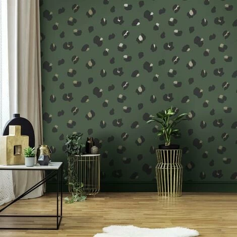 Transform your living space with this amazing large leopard spot wallpaper from Holden Décor. Features a stunning leopard spot print with gold metallic detail throughout, finished in a green colourway for a truly mesmerising wallcovering.
