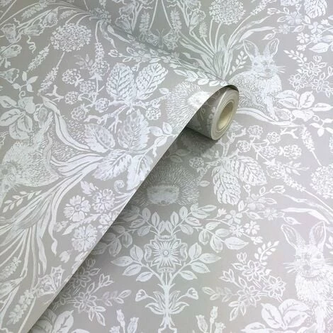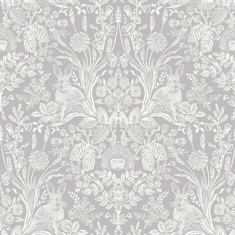 This stylish Woodland Damask wallpaper will make a great statement in most rooms of your home. It features a beautiful handpainted style design of woodland animals, flowers and leaves in white that form an intricate damask like pattern. This eye-catching wallpaper has a stylish design and is sure to make a welcome addition to any room or feature wall. Additional Product Information: Pattern Repeat: 53cm Pattern Match: Straight Match Wallpaper Type: Modern Wallpaper Finish: Flat Durability: Spongeable Roll Length: 10m Roll Width: 52cm Roll Coverage is 5.2 Square Metres Application: Paste the Paper