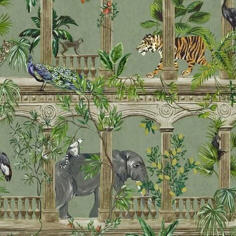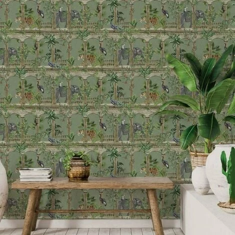 Material: Non-Woven. Design: Animals, Elephant, Jungle, Tiger. Design Repeat: 32cm. Easy Application, Easy To Remove, Offset Pattern Match, Paste the Wall.