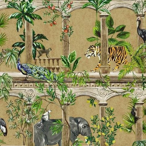 Material: Paper. Width: 53cm. Length: 10m. Design: Animals, Arch, Hand-Painted, Plants, Tropical. Design Repeat: 64cm. Easy Application, Offset Pattern Match, Paste the Paper. Finish: Sheen, Textured.