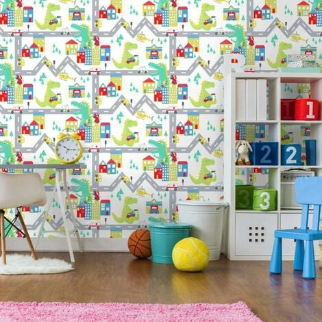 Design: Car, Dinosaurs, Houses, Road, Trees. Design Repeat: 53cm. Easy Application, Easy To Remove, Offset Pattern Match, Paste the Paper. Finish: Matte.