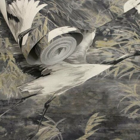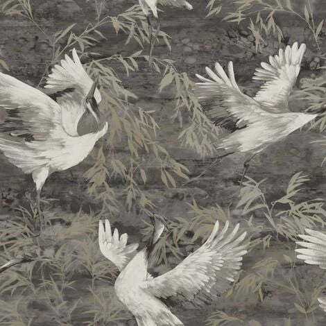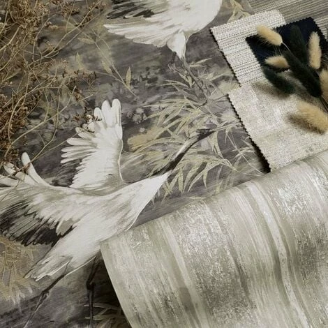 Design: Crane, Leaves, Trees. Design Repeat: 26.5cm. Easy Application, Offset Pattern Match, Paste the Wall. Heavyweight. Finish: Metallic.