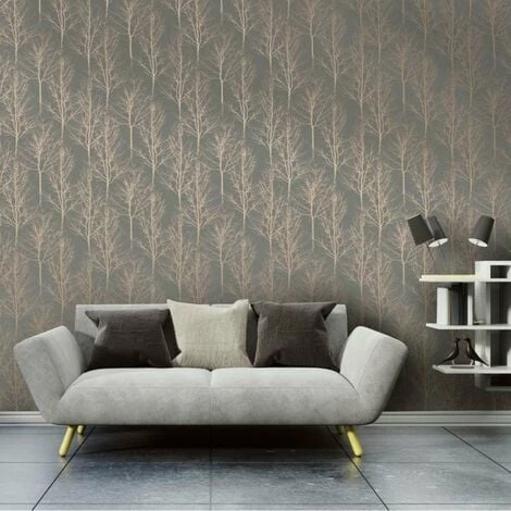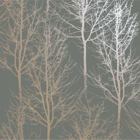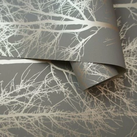Material: Paper. Design: Tree Silhouette. Design Repeat: 53cm. Easy Application, Offset Pattern Match, Paste the Paper. Finish: Matte, Metallic.
