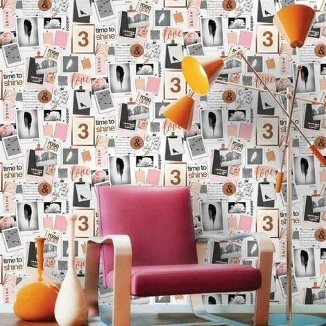 An all over wallpaper design featuring an array of pink colour swatches, images and text, which creates a collage pattern when hung! This fantastically designed modern wallpaper will look amazing wherever you chose to hang it.
