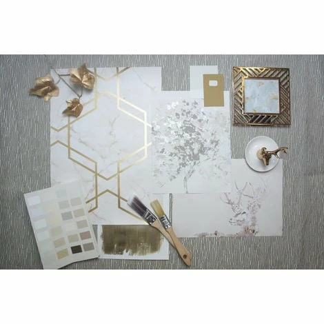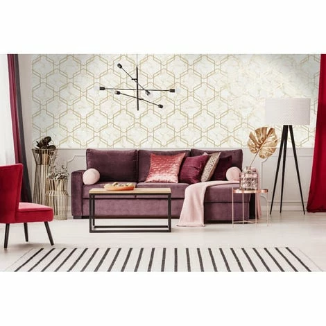 This fantastic modern wallpaper will give your home a sophisticated and modern look, with a gorgeous subtle marble design contrasting against an overlapping metallic geometric with a glitter line, this paper will truly look stunning wherever it hangs! Can be used as a feature wall effect or on all 4 walls for the full effect.