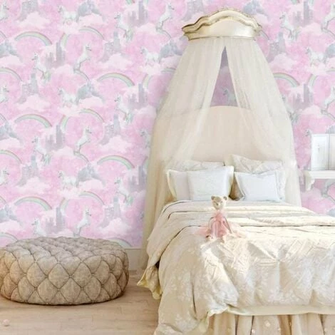 This I Believe In Unicorns Wallpaper will add a touch of magic to your little one’s bedroom or playroom. The beautiful design features unicorns, clouds, castles and rainbows in pretty muted tones on a pink background, with subtle glitter highlights for added effect. Easy to apply, this high quality wallpaper would look great when used to create a stylish feature wall or to decorate an entire room.