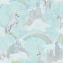 This I Believe In Unicorns Wallpaper will add a touch of magic to your little one’s bedroom or playroom. The beautiful design features unicorns, clouds, castles and rainbows in pretty muted tones on a soft teal background, with subtle glitter highlights for added effect. Easy to apply, this high quality wallpaper would look great when used to create a stylish feature wall or to decorate an entire room.