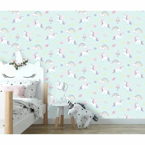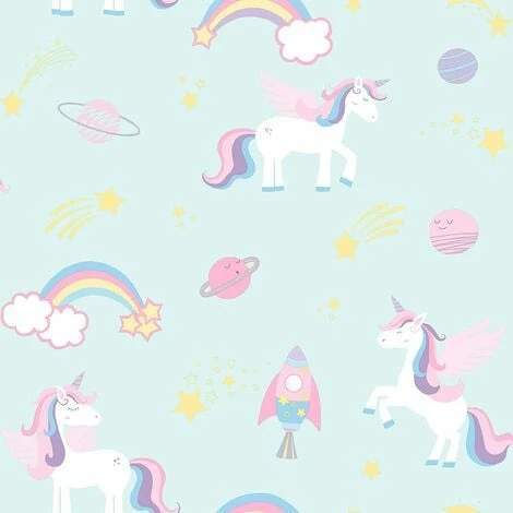 This gorgeous glittery wallpaper features unicorns, rockets, rainbows, planets, stars and clouds. Ideal for playrooms and children’s bedrooms. This high quality wallpaper could be used to create a feature wall or to decorate an entire room. Additional Product Information: Pattern Repeat: 53/26.5cm Pattern Match: Offset Match Wallpaper Type: Paper Wallpaper Finish: Flat Durability: Washable Roll Length: 10m Roll Width: 53cm Roll Coverage is 5.3 Square Metres Application: Paste the Paper