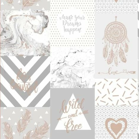 The Holden Decor Life is Beautiful Grey/ Rose Gold Metallic Wallpaper is an easy way to add a dash of colour to your walls. This striking wallpaper is sure to make a welcome addition to your home. Featuring a beautiful design which embraces life and is perfect for lifting your mood with motivational quotes, a variety of geometrics and quirky motifs. Features a grey and white colour scheme with metallic rose gold accents for a truly mesmerising wallpaper.