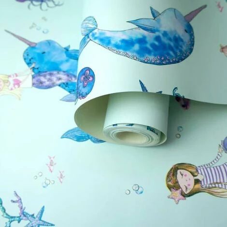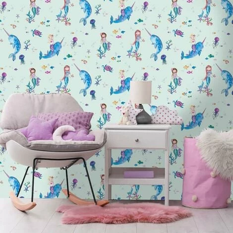 This amazing narwhals and mermaids wallpaper from Holden is a sure way to add a touch of class and style to your walls. Features prints of narwhals and mermaids with glitter detail throughout, set on a lovely teal background a truly mesmerising wallpaper.