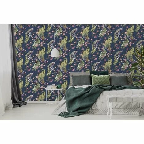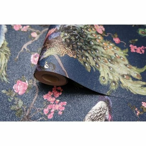 The Holden Decor Menali Navy Wallpaper is an easy way to add a dash of colour to your walls. This striking wallpaper is sure to make a welcome addition to your home. Features a resting peacock pattern on forest trees and leaves, infused with sparking metallic glitter and set on a stripe textured navy background for a truly mesmerising wallpaper.
