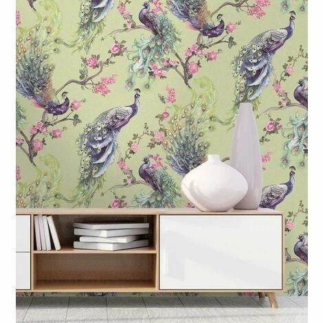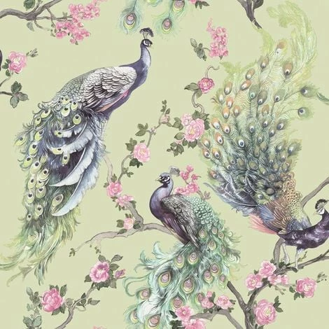 The Holden Decor Menali Green Wallpaper is an easy way to add a dash of colour to your walls. This striking wallpaper is sure to make a welcome addition to your home. Features a resting peacock pattern on forest trees and leaves, infused with sparking metallic glitter and set on a stripe textured green background for a truly mesmerising wallpaper.