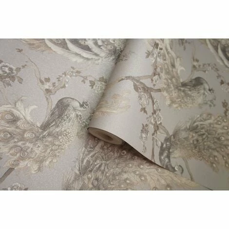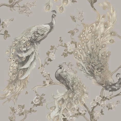 The Holden Decor Menali Grey Wallpaper is an easy way to add a dash of colour to your walls. This striking wallpaper is sure to make a welcome addition to your home. Features a resting peacock pattern on forest trees and leaves, infused with sparking metallic glitter and set on a stripe textured grey background for a truly mesmerising wallpaper.