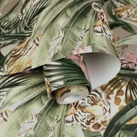 Transform your living space with this amazing safari fusion wallpaper from Holden Decor. Features a stunning tropical jungle style print with exotic animals and colourful detail throughout, finished with a Gilver metallic coloured background for a truly mesmerising wallpaper. Follow the modern trends with this wallpaper.
